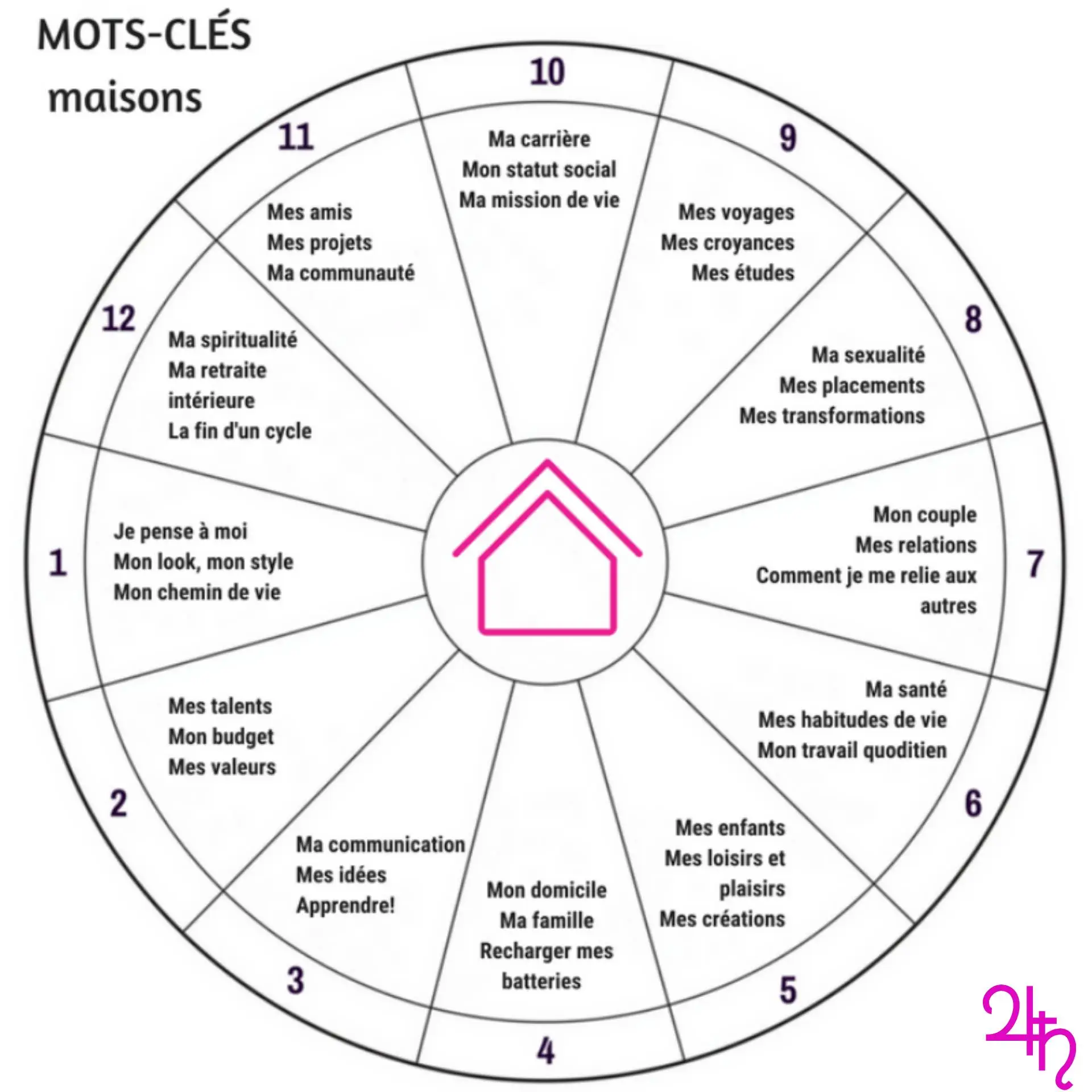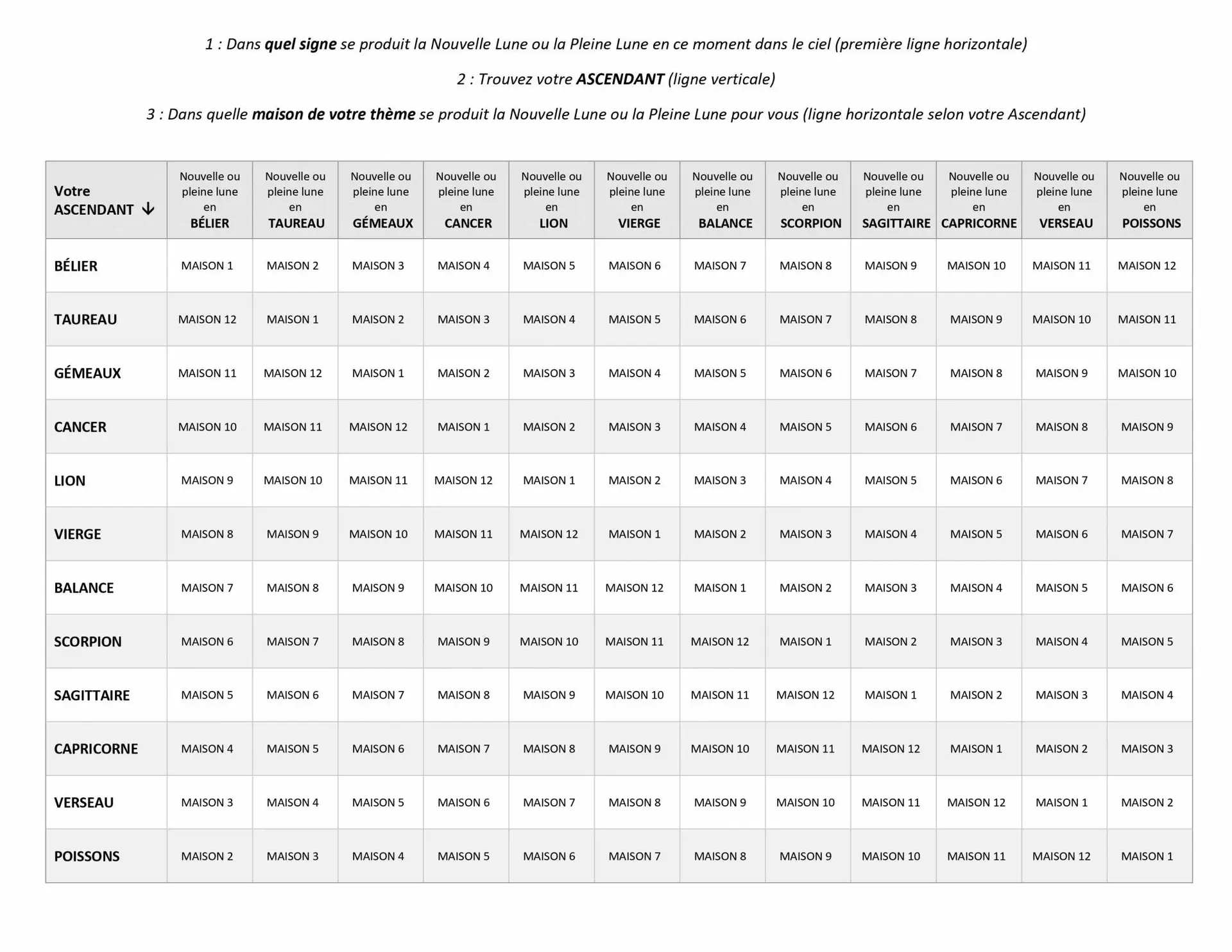 Je vous offre un tableau très pratique qui vous permettra de savoir quel secteur de votre vie est activé lors de chaque Nouvelle Lune!